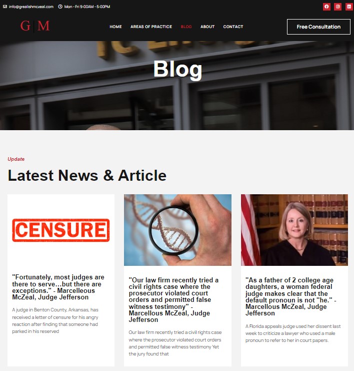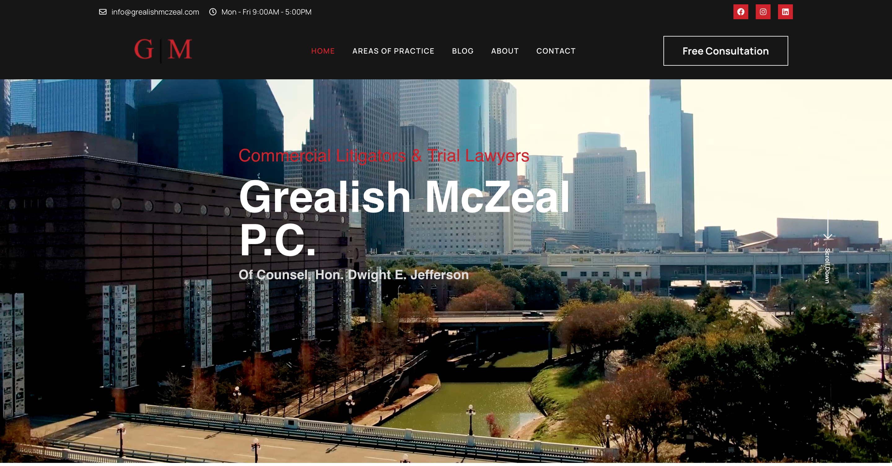 CB Agency was brought on to refresh Grealish McZeal’s website and branding across all online channels including LinkedIn, Google and social media. Grealish McZeal is a prestigious firm that offers litigation support to Houstonians. During this time, our team conducted a photo and video shoot, drafted and edited the messaging and overall copy for the site and updated the brand’s social channels so they align with site updates and naming conventions overall. To also increase Grealish McZeal’s search traffic, the team implemented a blog forum on the website led by the Honorable Marcellous McZeal. From CB Agency’s efforts, Grealish McZeal saw a 67% increase in online traffic in two months.